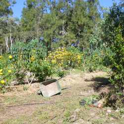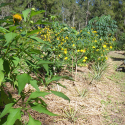 La production maraîchère couvre un demi-hectare, mis en place en partie selon les principes de la permaculture et en partie selon les principes de l'agroforesterie et de l'agriculture syntropique. Il s'agit de créer des écosystèmes très diversifiées qui s'autorégulent ce qui permet, à terme, de diminuer significativement les besoins en eau, en engrais et en paillage. Des amendements en compost en engrais Bio ont été réalisés initialement.